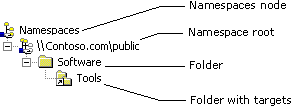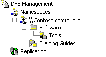 As the figure shows, the Namespaces node contains the namespaces you create as well as any existing namespaces you add to the console display. In the previous figure, one namespace is shown, \\Contoso.com\Public. Under each namespace is a hierarchical view of folders. Folders that have targets use a special icon to differentiate them from folders that do not have targets.