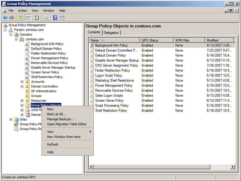 As a final step before your production deployment, you should back up your staging GPOs. A backup is required if you are using a GPO import to perform your migration from staging to production. This method is required when your staging environment is in a forest that is separate from and not trusted by your production domain, or when you need to update an existing GPO that already exists in your production environment. You can use the GPMC to back up one or more GPOs, or you can use the sample script BackupGPO.wsf to back up a single GPO or all GPOs in the staging domain. To back up a GPO by using the GPMC, in the GPMC console tree, right-click the GPO that you want to back up, and then click Backup.