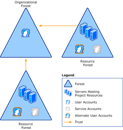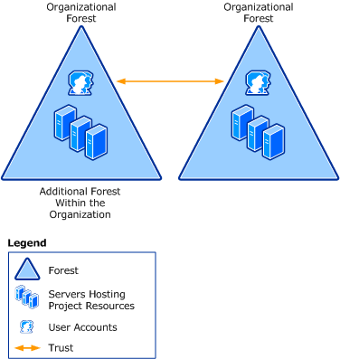 If users in an organizational forest need to access resources in other forests (or the reverse), trust relationships can be established between one organizational forest and the other forests. This makes it possible for administrators to grant access to resources in the other forest. The following illustration shows the organizational forest model.