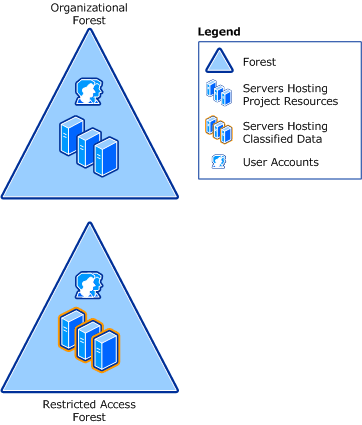 In the restricted access forest model, a separate forest is created to contain user accounts and data that must be isolated from the rest of the organization. Restricted access forests provide data isolation in situations where the consequences of compromising project data are severe. The following illustration shows a restricted access forest model.