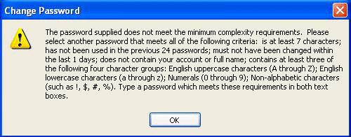 Password complexity errors on Windows XP® client computers: When a user to whom an FGPP applies attempts to change his or her password on a client computer that is running the Windows XP operating system, an error message appears, informing the user that the new password does not conform to the settings that are defined in the domain policy, instead of informing the user that the new password does not conform to the settings that are defined in the FGPP. The following illustration describes this error message: