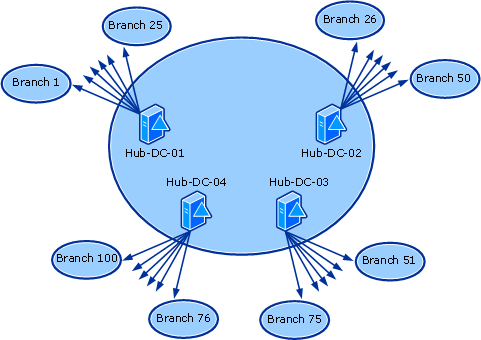 For example, assume that there is a hub site with four bridgehead servers, named Hub-DC-01 through Hub-DC-04, as shown in the following illustration. There are 100 RODCs that perform inbound replication from the four bridgehead servers—a 25:1 ratio.