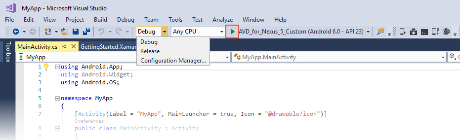 在 Visual Studio 的顶部附近,有一个可用于选择“调试”或“发布”模式的下拉菜单。 选择“调试”可在应用启动后将调试器附加到仿真器内运行的应用程序进程。 选择“发布”模式可禁用调试器(但是,仍可运行应用并使用 LOG 语句进行调试)。 在设备下拉菜单中选择虚拟设备后,选择“调试”或“发布”模式,然后单击“播放”按钮运行应用程序: