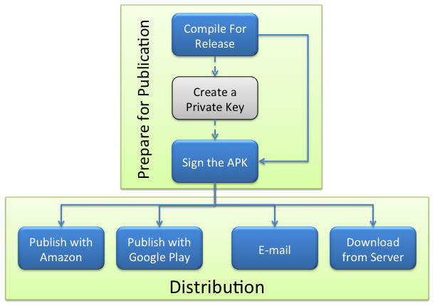 如上图所示,所有分发方式的准备过程都是相同的。 可通过以下几种方式将 Android 应用程序发布给用户: