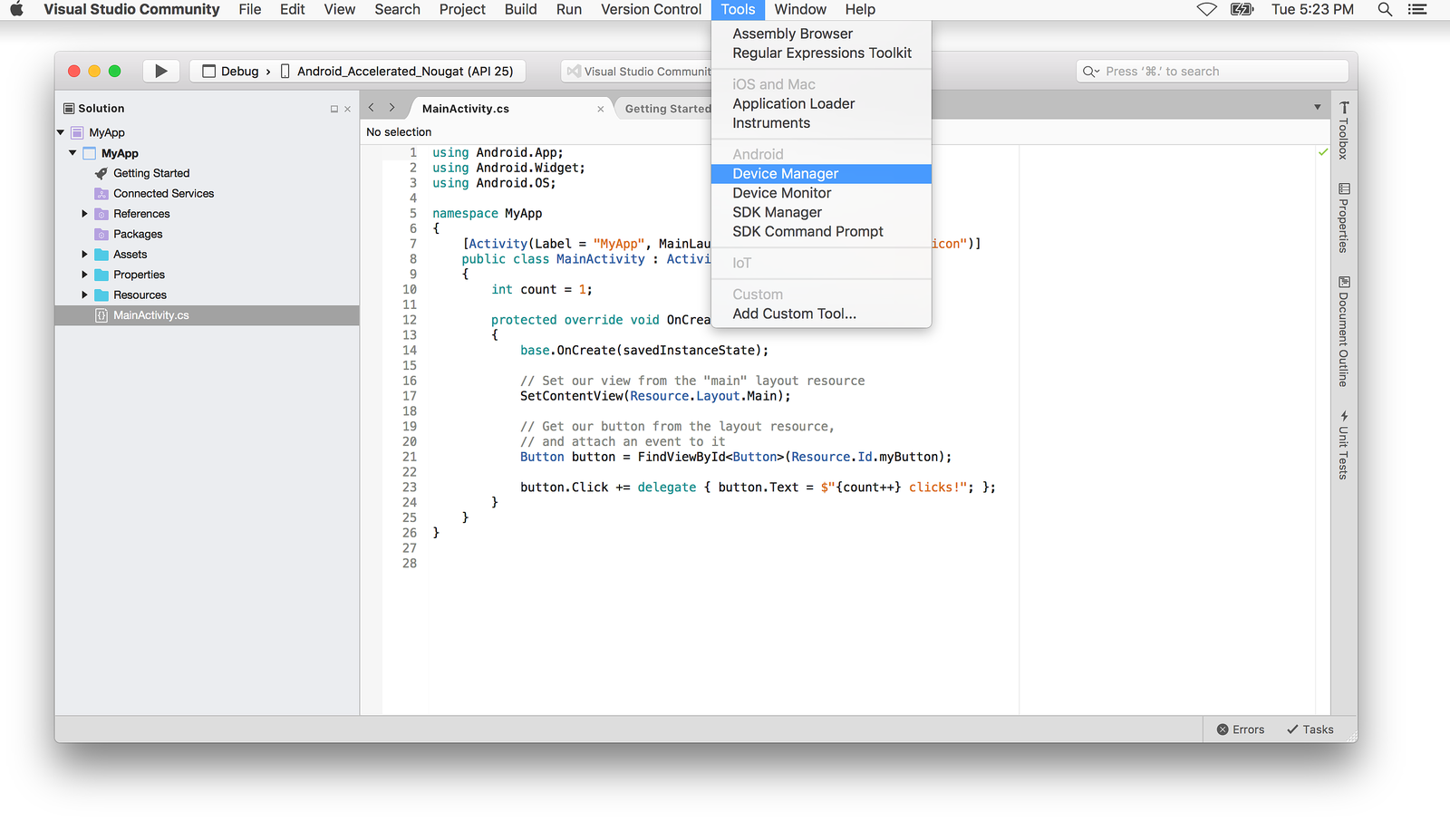 验证硬件加速已启用后(如通过硬件加速提高仿真器性能中所述),下一步是使用 Android Device Manager(也称为 Xamarin Android Device Manager)创建用于测试和调试应用的虚拟设备。