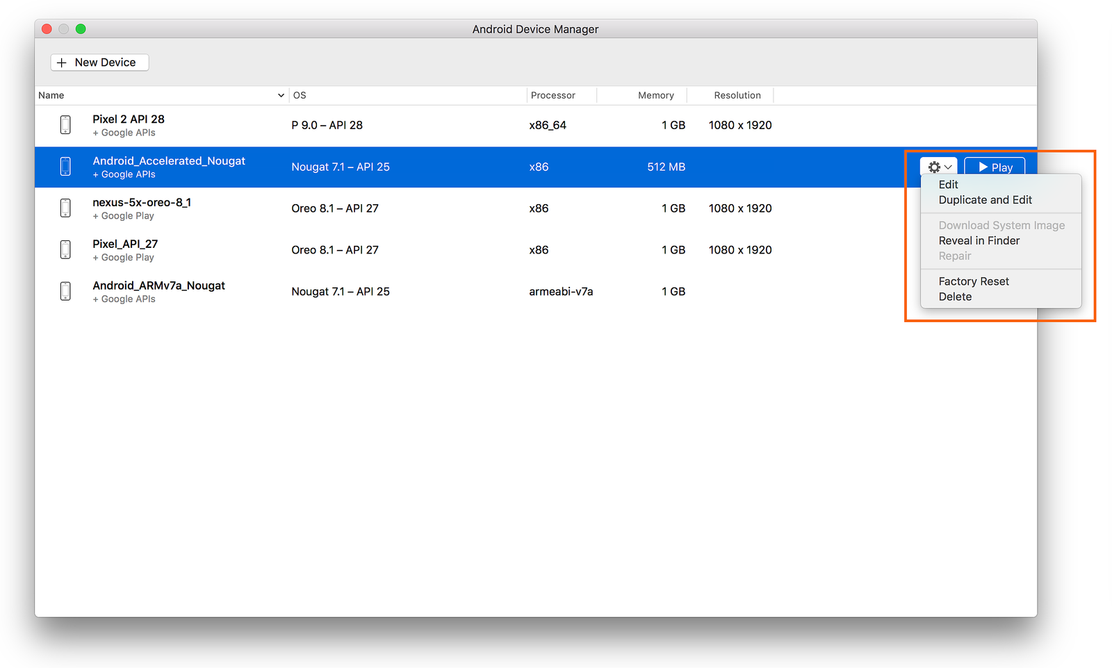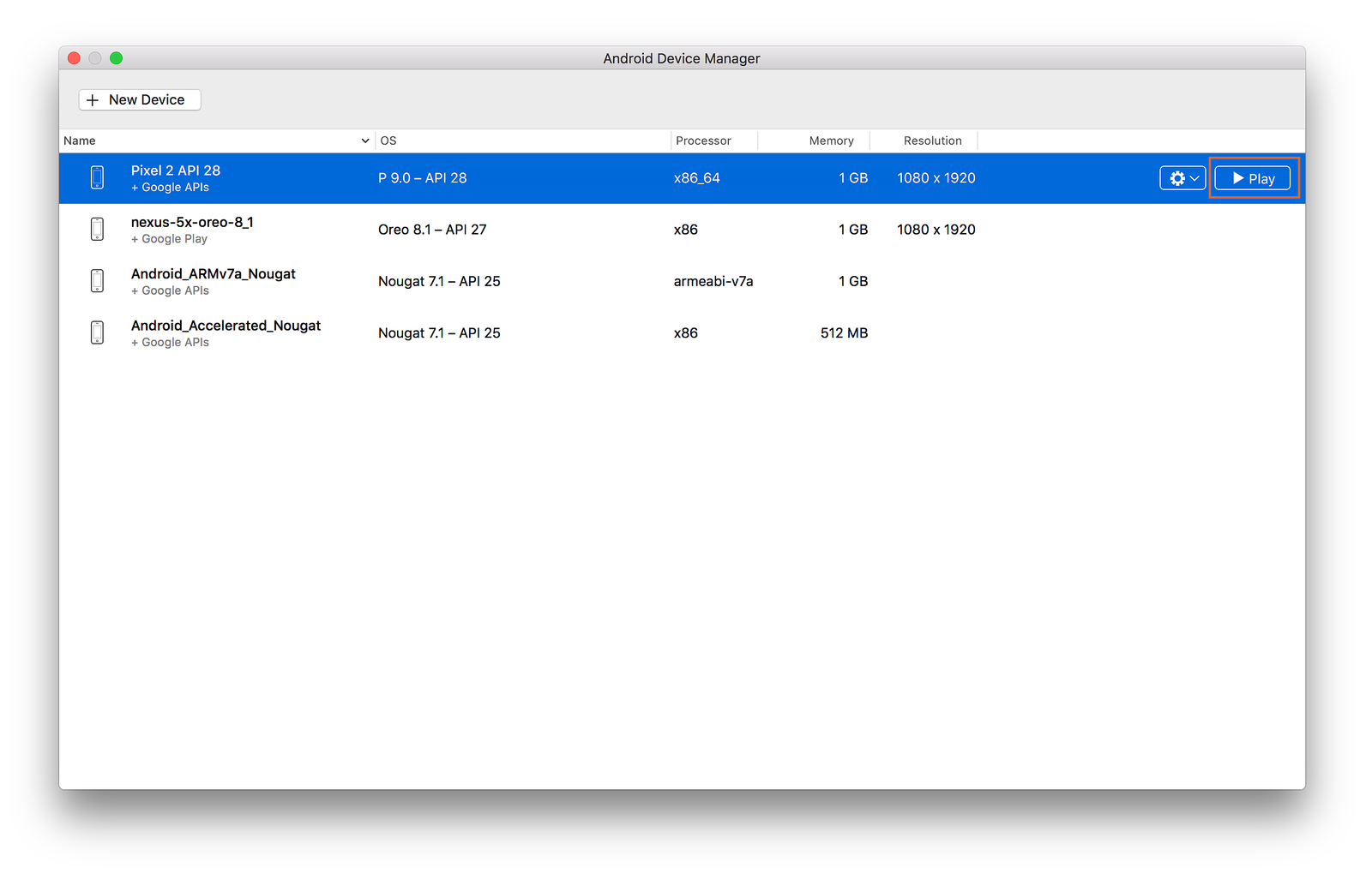 选择列表中的设备时,“播放”按钮出现在右侧。 可以单击“播放”按钮以通过此虚拟设备启动仿真器: