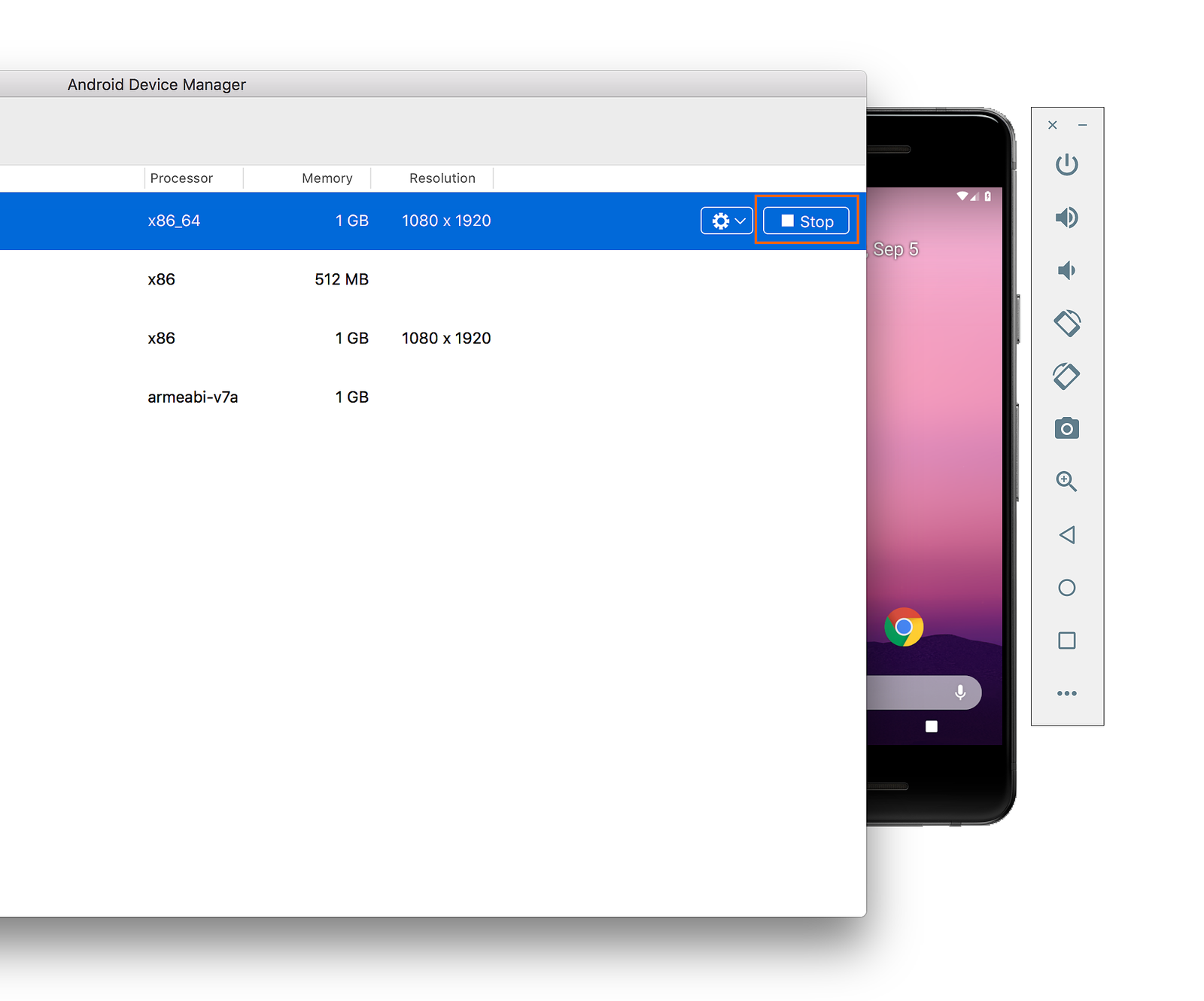 通过所选虚拟设备启动仿真器后,“启动”按钮将更改为可用于终止运行仿真器的“停止”按钮: