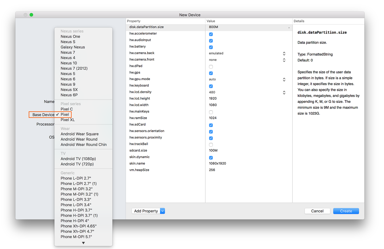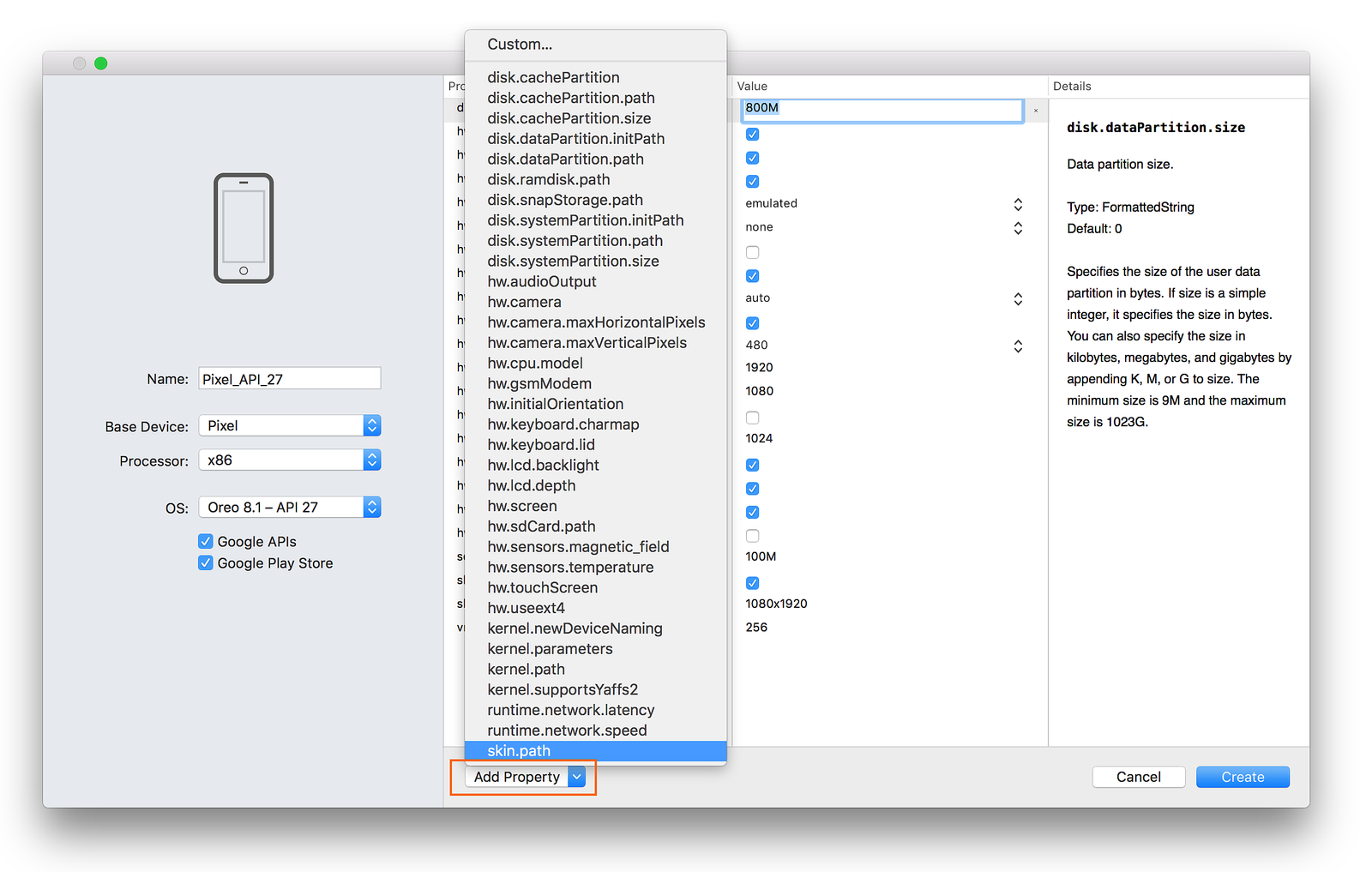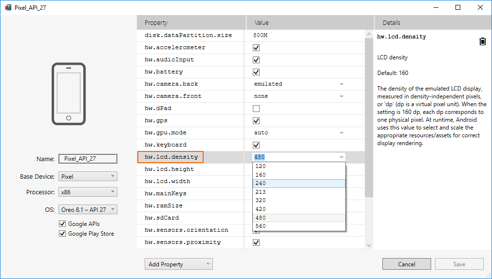 例如,在下面的屏幕截图中,hw.lcd.density 属性正从“480”更改为“240”:
