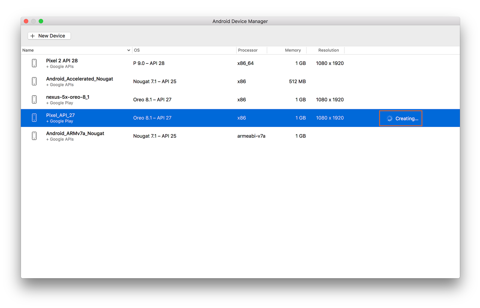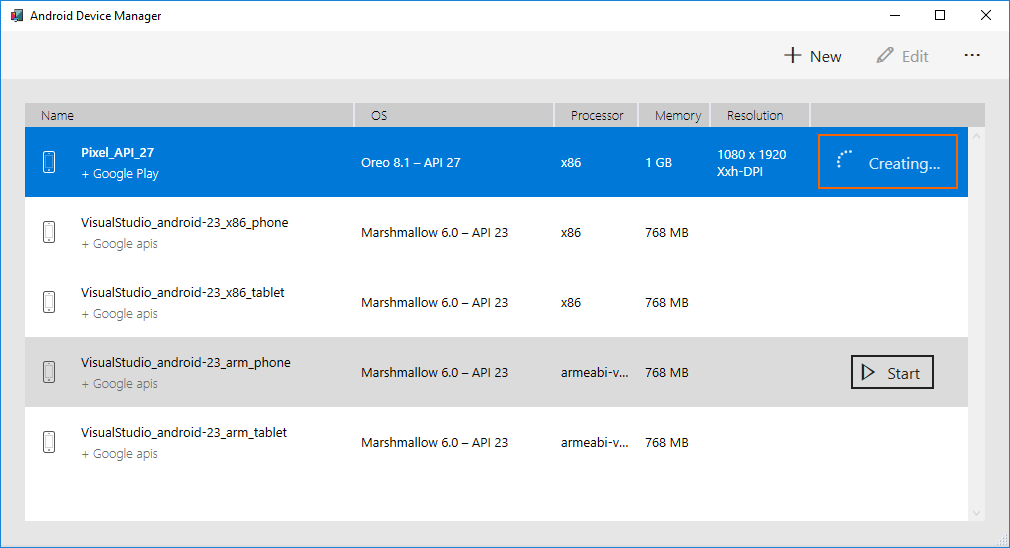 在设备创建期间,Android Device Manager 将新设备添加到已安装虚拟设备列表中,同时显示“正在创建”进度指示器: