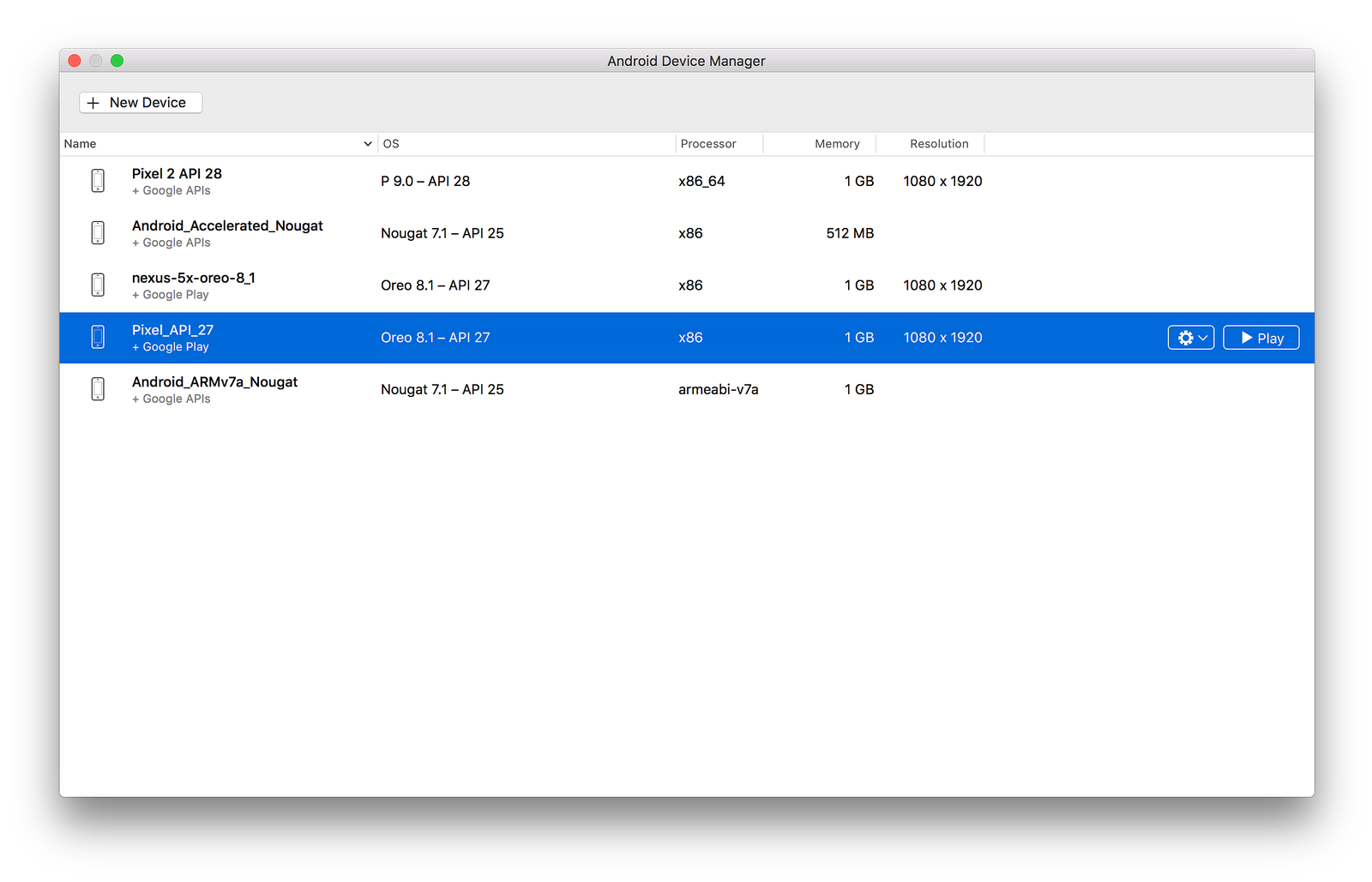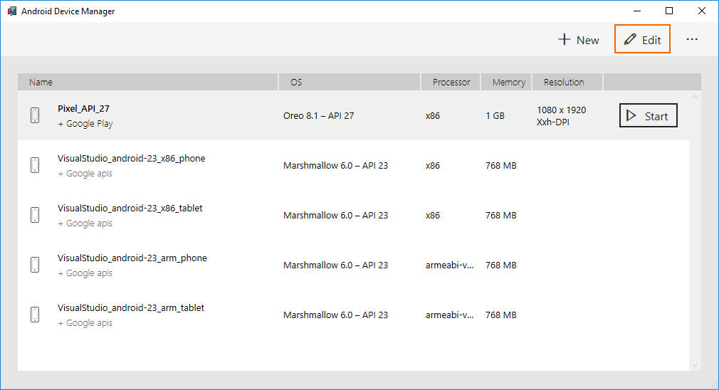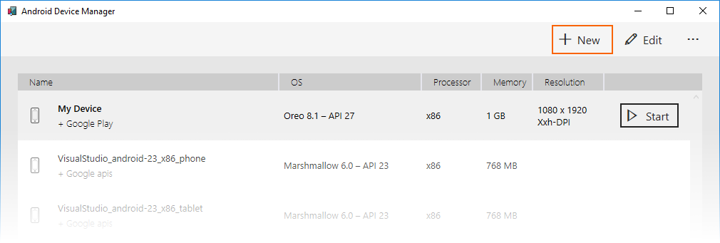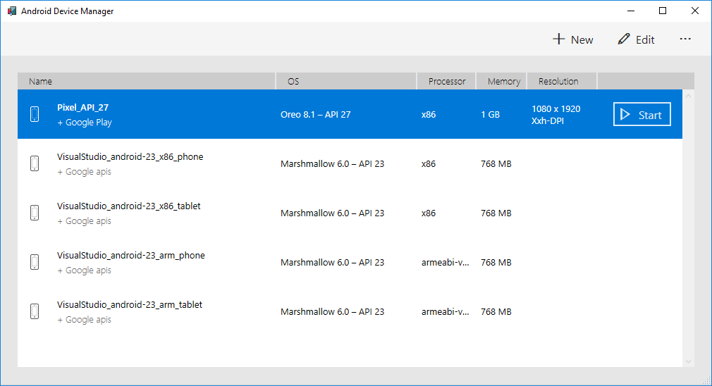 首次启动 Android 设备管理器时,它会展现一个显示所有当前已配置的虚拟设备的屏幕。 对于每台虚拟设备,将显示“名称”、“OS”(Android 版)、“处理器”、“内存”大小以及屏幕“分辨率”: