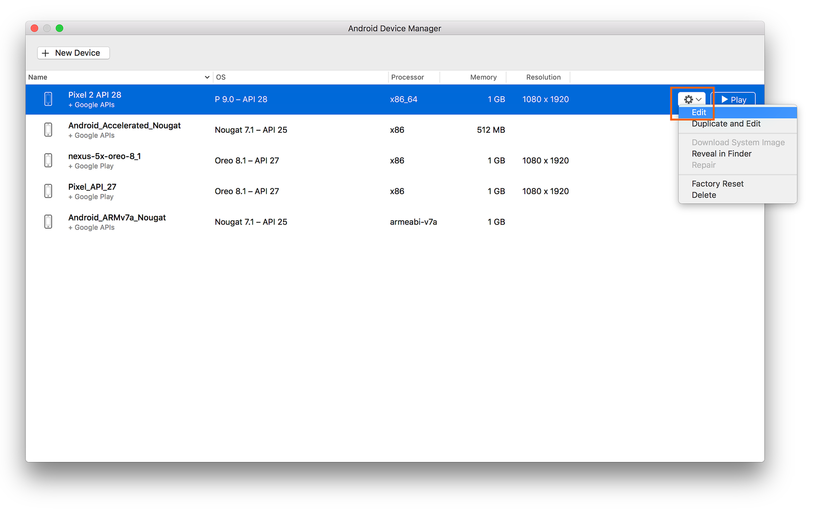 复制和编辑 – 复制当前所选的设备,并会在“新建设备”屏幕中使用不同的唯一名称将其打开。 例如,选择“Pixel_API_27”并单击“复制和编辑”可将计数器追加到名称中: