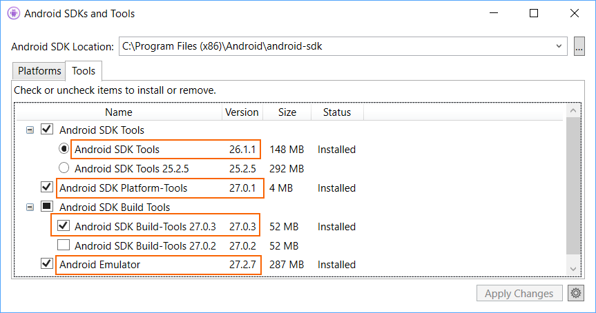 - Android SDK Tools 版本 26.1.1 或更高版本