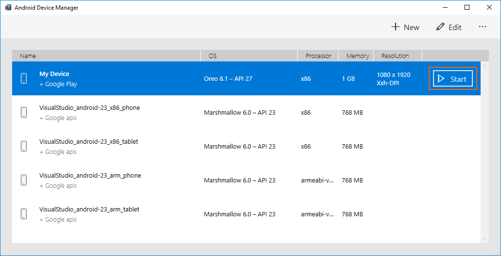 选择列表中的设备时,“启动”按钮出现在右侧。 可以单击“启动”按钮以通过此虚拟设备启动仿真器: