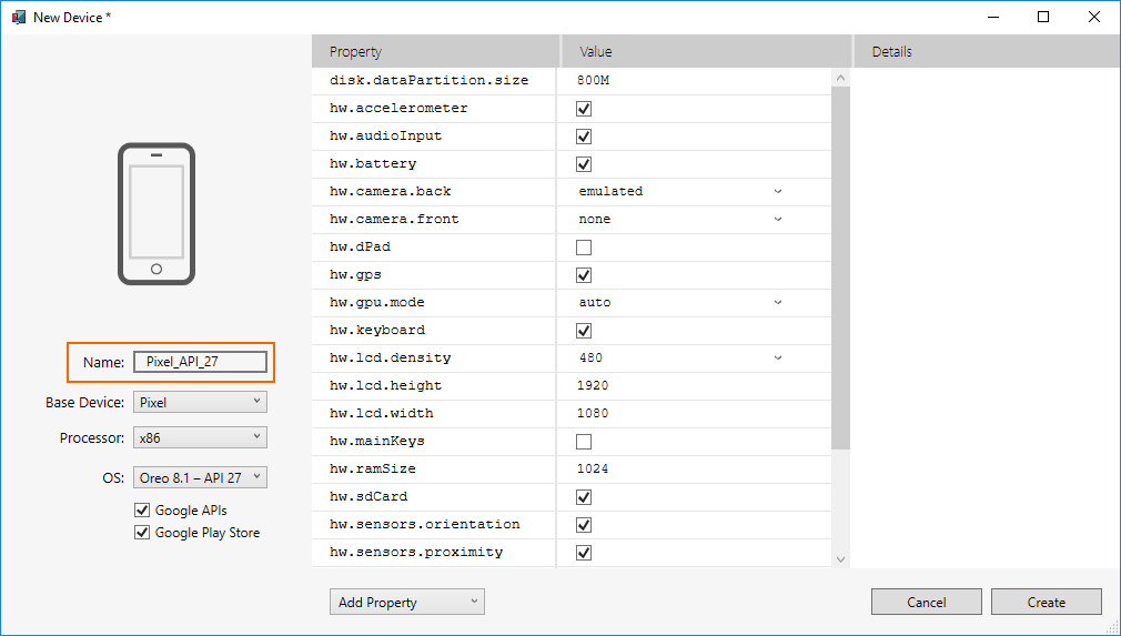 为设备提供新名称。 在下面的示例中,新设备名为“Pixel_API_27”: