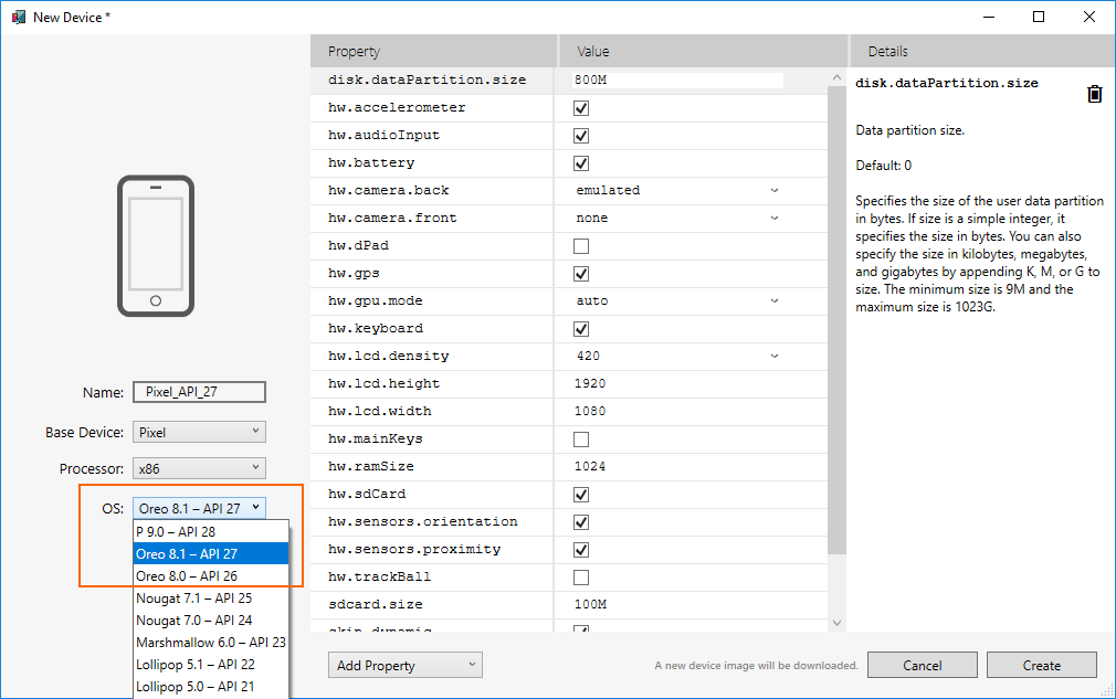 如果选择尚未安装的 Android API 级别,Device Manager 将在屏幕底部显示“将下载新设备”消息。它将在创建新的虚拟设备时,下载并安装必要的文件: