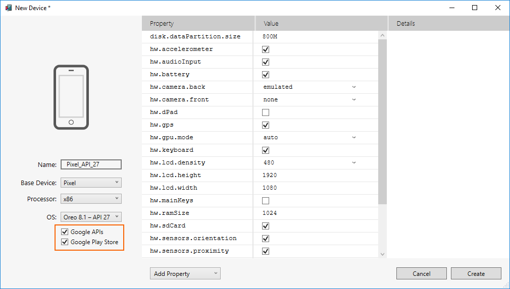 如果希望虚拟设备中包含 Google Play Services API,请启用“Google API”选项。 若要包含 Google Play 商店应用,请启用“Google Play 商店”选项: