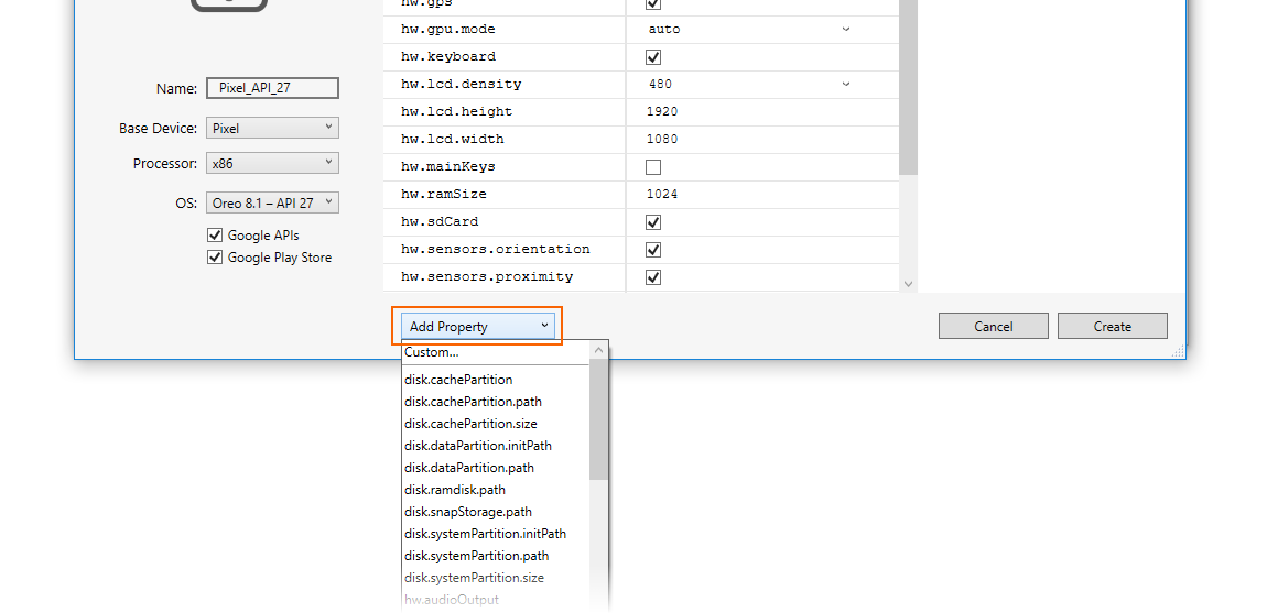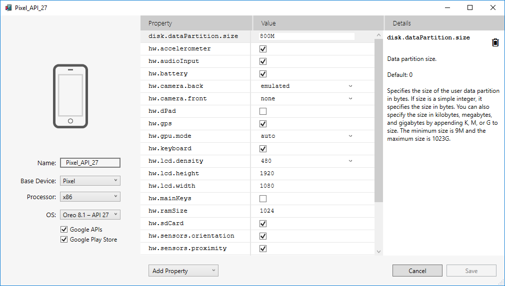 编辑需要修改的任何属性。 若要对属性进行更改,请参阅编辑 Android 虚拟设备属性。