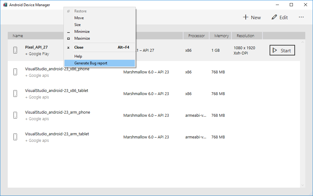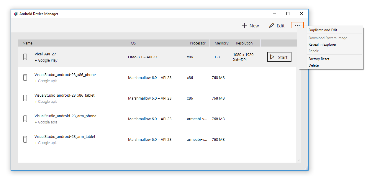 本指南介绍 Visual Studio Tools for Xamarin 和 Visual Studio for Mac 中提供的 Android Device Manager。 其中介绍了启动和停止 Android 仿真器、选择要运行的 Android 虚拟设备 (AVD)、创建新的虚拟设备以及如何编辑虚拟设备等基本功能。 还介绍了如何编辑配置文件硬件属性以便进一步进行自定义并提供了常见问题的故障排除技巧。