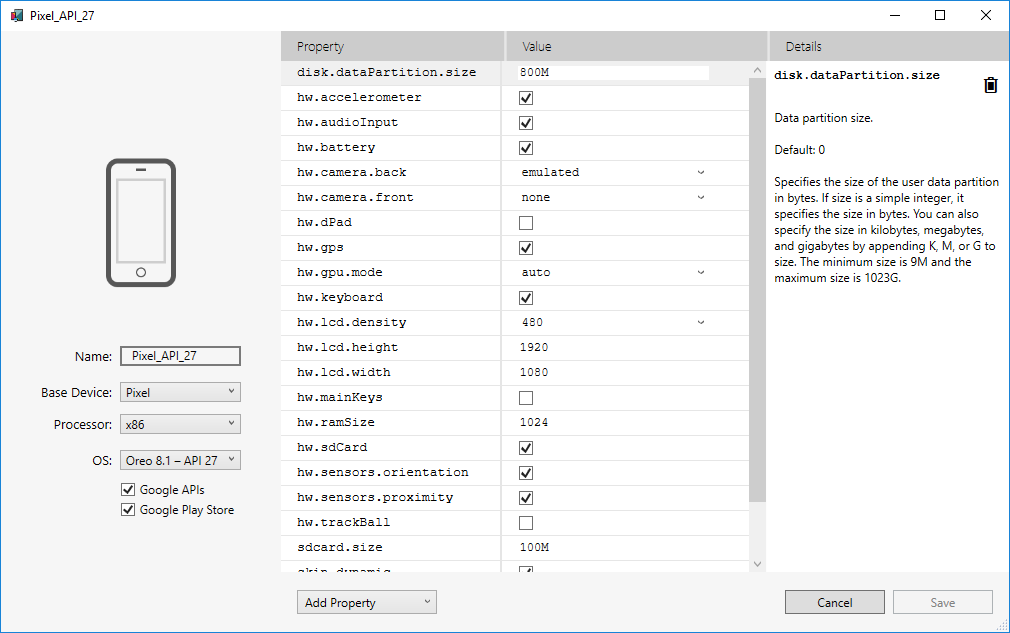 当选择某个属性时,有关该属性的详细描述会显示在右侧。 可以修改“硬件配置文件属性”和“AVD 属性”。 硬件配置文件属性(如hw.ramSize 和 hw.accelerometer)描述仿真设备的物理特征。 这些特征包括屏幕大小、可用的 RAM 量以及是否具有加速计。 AVD 属性指定 AVD 在运行时的操作。 例如,可以配置 AVD 属性以指定 AVD 如何使用开发计算机的图形卡进行呈现。