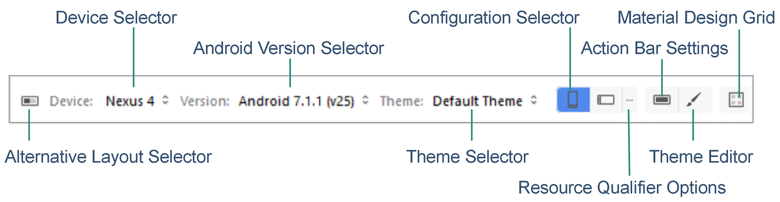 Designer 工具栏 - 显示选择器列表:设备、版本、主题、布局配置和操作栏设置。 Designer 工具栏还包括用于启动主题编辑器和启用材料设计网格的图标。