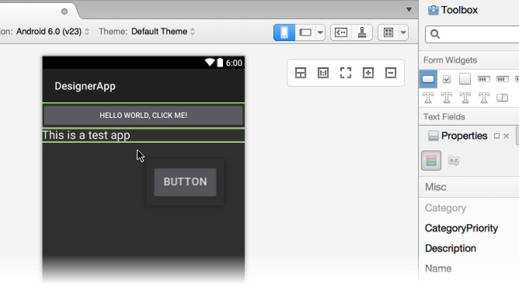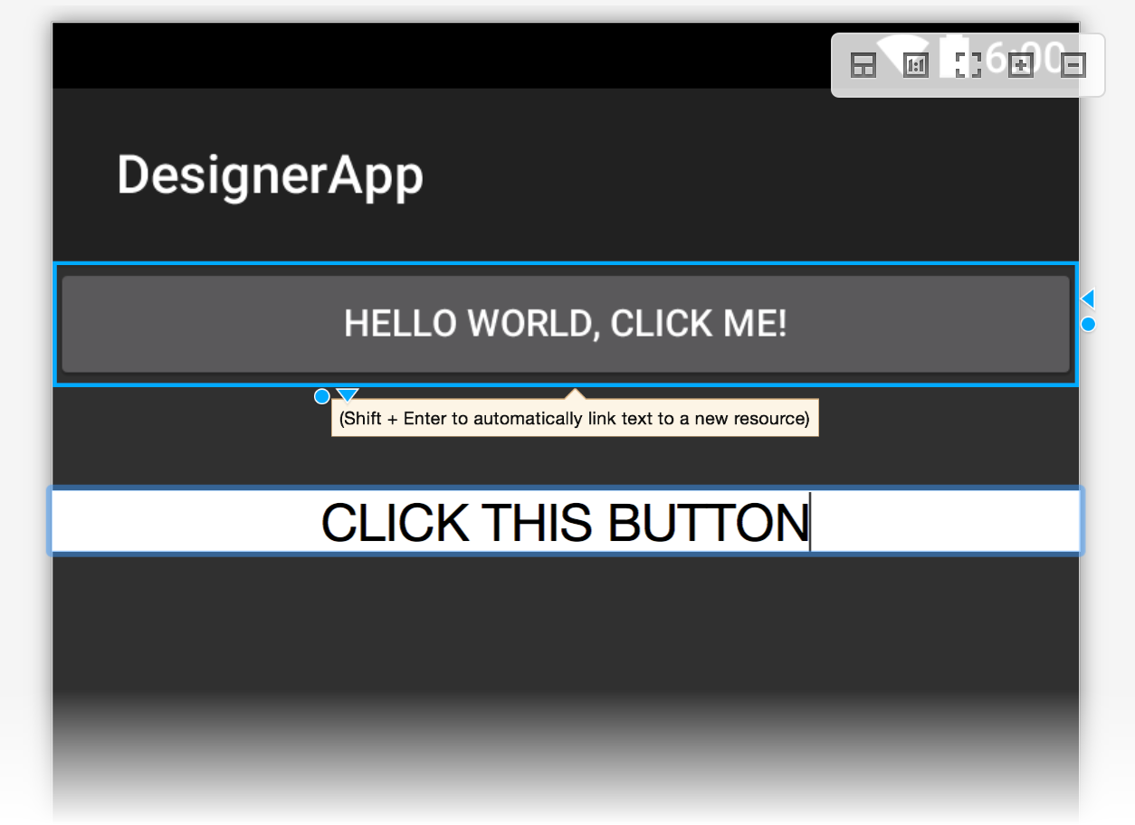 某些小组件(如 Button 和 TextView)的文本属性可以直接在 Design Surface 上编辑。 双击小组件将进入编辑模式,如下所示: