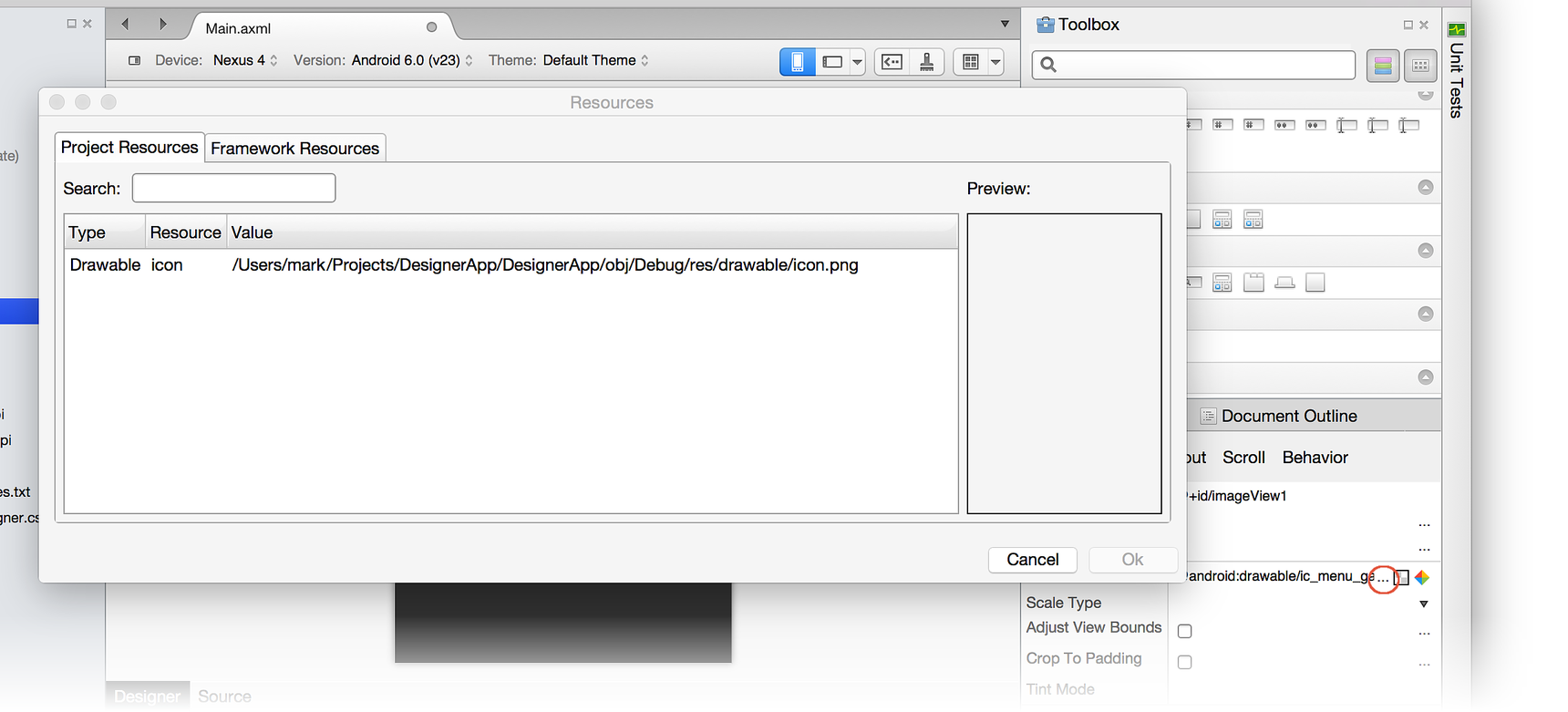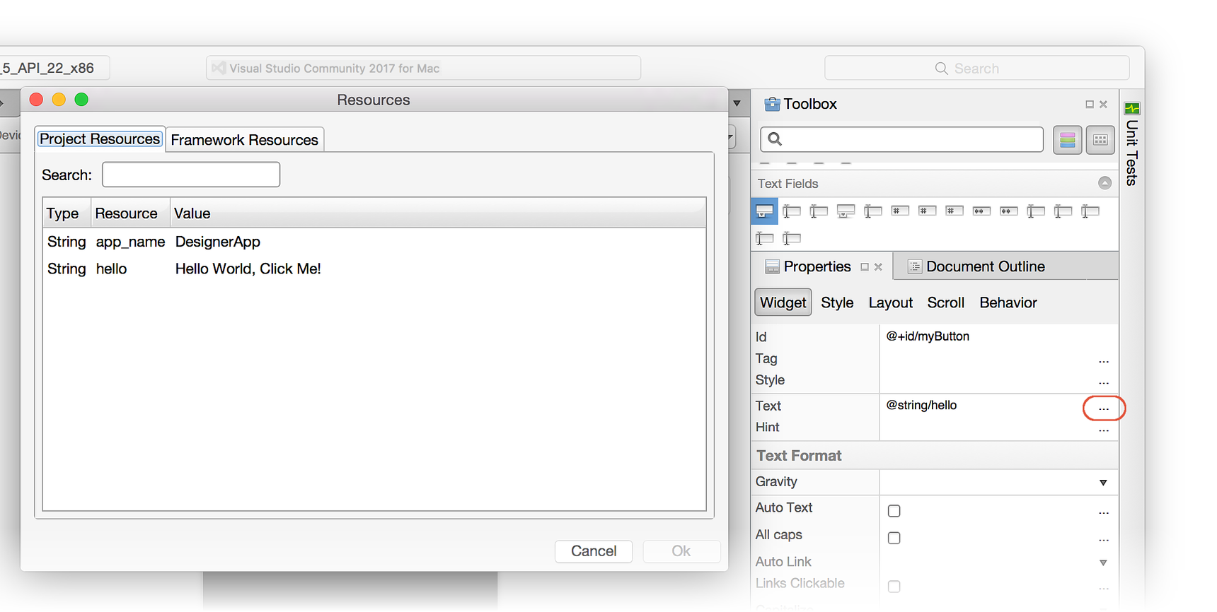 某些属性可以引用布局 .axml 文件以外的其他文件中定义的资源。 此类型的最常见情况是 string 和 drawable 资源。 但是,还可以将引用用于其他资源,例如 Boolean 值和维度。 当属性支持资源引用时,属性的文本条目旁边会显示一个浏览图标(一个正方形)。 单击此按钮会打开资源选择器。