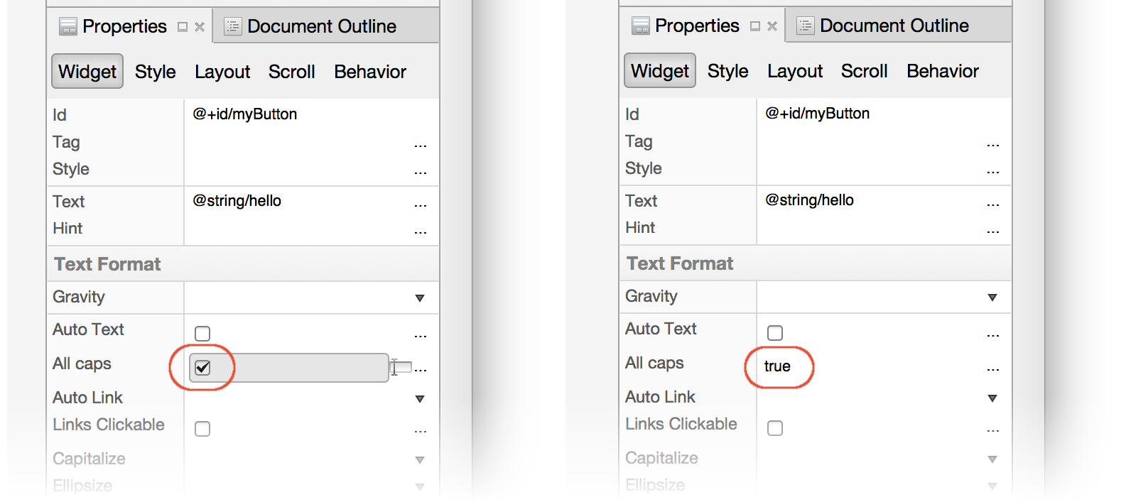 布尔属性通常在属性窗口中通过属性旁边的复选标记来选定。 可以通过选中或取消选中该复选框来指定 true 或 false 值,也可以通过单击属性右侧的深色填充正方形来选择属性引用。 在下面的示例中,通过单击与所选 TextView 关联的“文本全大写”布尔属性引用,将文本更改为全大写: