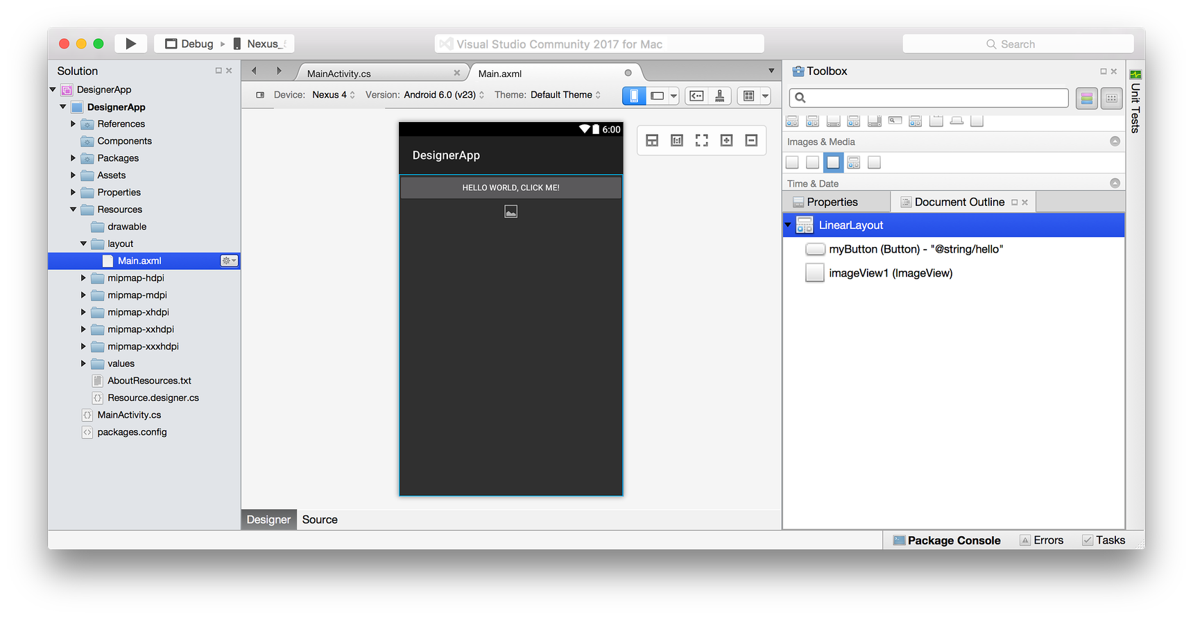 Designer 在创建布局时自动启动,也可通过双击现有布局文件启动。 例如,双击“资源”>“布局”文件夹中的“activity_main.axml”将会加载 Designer,如以下屏幕截图所示: