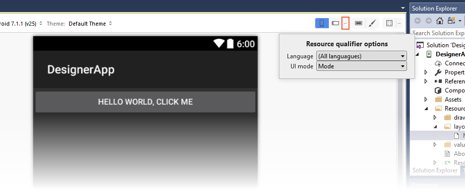 单击“横屏”模式按钮右侧的省略号图标,即可访问资源限定条件选项: