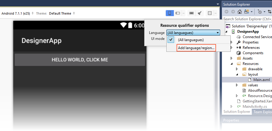 “语言”下拉菜单仅列出已定义资源的语言(或默认的“所有语言”)。 但是,还有一个“添加语言/区域...”选项,可用于向列表中添加新的语言: