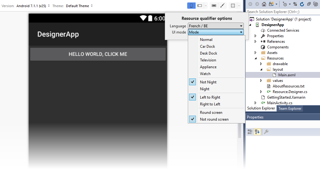 Android“版本”选择器可设置用于在设计器中呈现布局的 Android 版本。 选择器会显示与项目的目标框架版本兼容的所有版本: