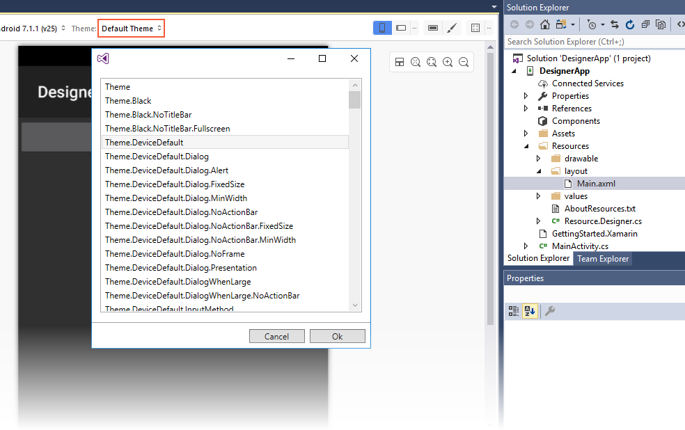 工具箱中可用的小组件集由项目的目标框架版本确定。 这也适用于“属性”窗口中可用的属性。 可用小组件列表不由工具栏的“版本”选择器中选择的值确定。 例如,如果将项目的目标版本设置为 Android 4.4,仍然可以在工具栏版本选择器中选择 Android 6.0,以查看项目在 Android 6.0 中的效果,但无法添加特定于 Android 6.0 的小组件,因为你仍然只能使用 Android 4.4 中提供的小组件。
