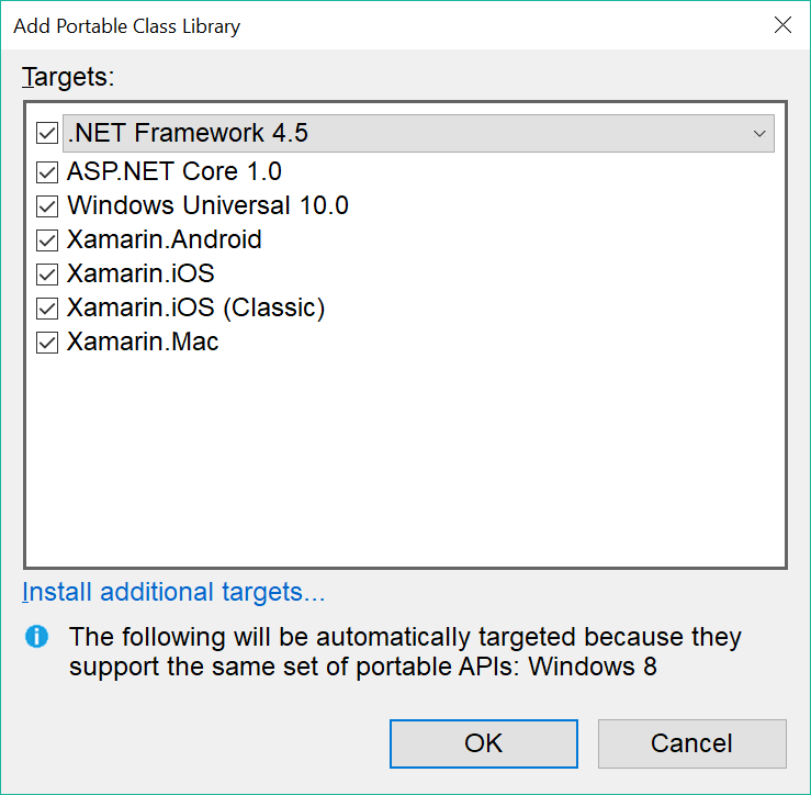 但是,创建可移植类库时,可以选择一个你想要运行代码的平台的组合。 创建可移植类库时所做的兼容性选择将转换为“配置文件”标识符,它描述了库支持的平台。