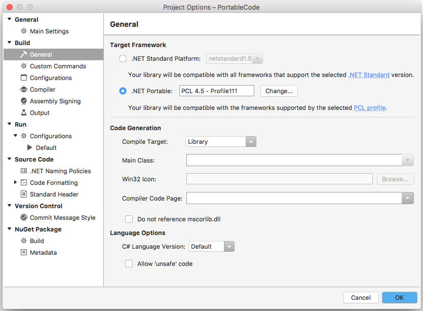 若要查看和更改此项目的 PCL 设置,请右键单击该项目,然后选择“选项 > 生成 > 常规”以查看如下所示的屏幕: