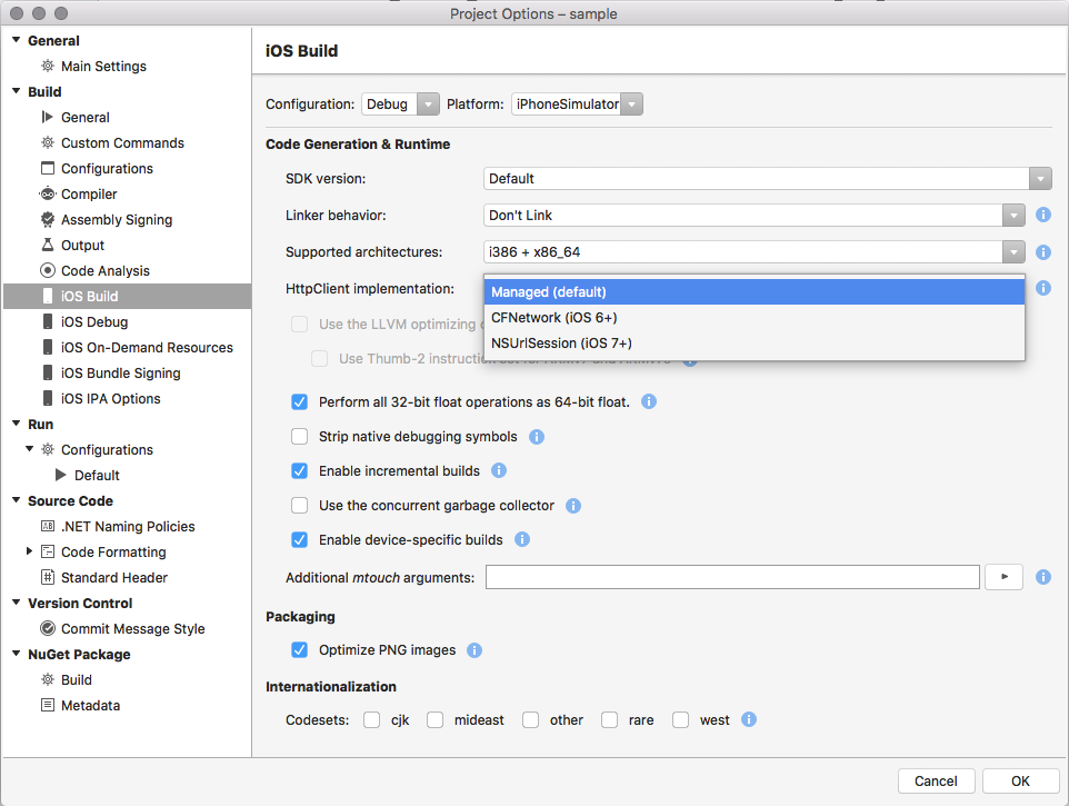 - 切换到项目的“生成”设置(例如,Xamarin.iOS 应用的“iOS 生成”)。
