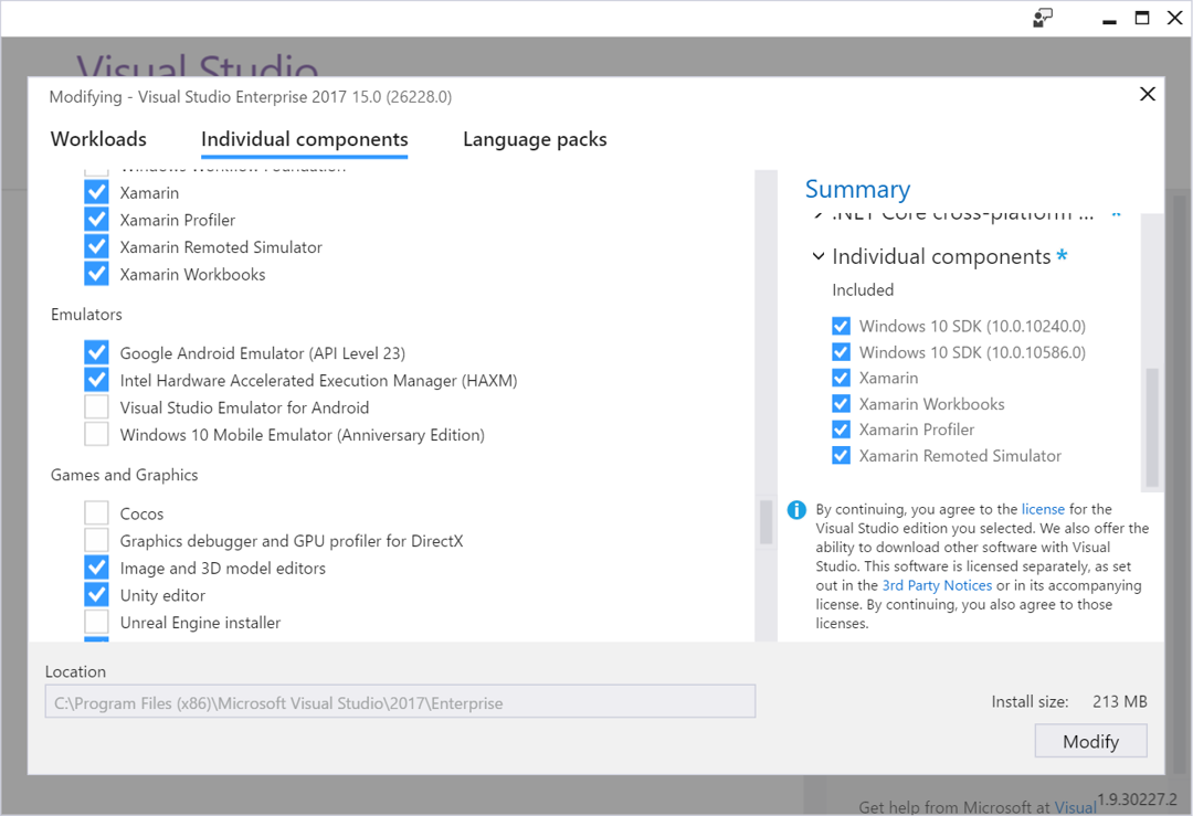通过在步骤 3 中切换到“各个组件”选项卡并取消选中特定组件,可卸载单个 Xamarin 组件(如 Profiler 或 Workbooks):