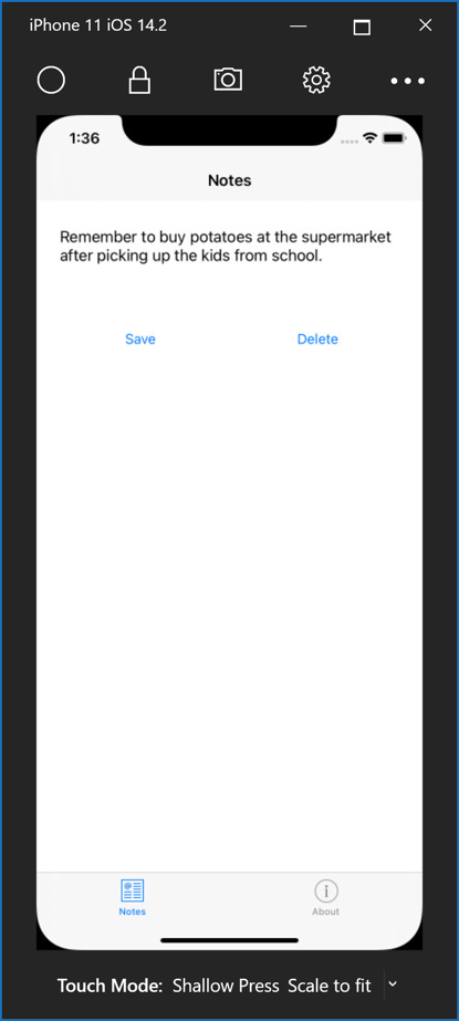 _fileName字段,该字段引用名为notes.txt的文件,而该文件将便笺数据存储在应用程序的本地应用程序数据文件夹中。 如果有文件,则在执行页构造函数时读取文件并将其显示在Editor中。 按“保存”Button时,会执行OnSaveButtonClicked事件处理程序,它将Editor的内容保存到文件中。 按“删除”Button时,会执行OnDeleteButtonClicked事件处理程序,它会删除文件(前提是它存在)并删除Editor中的任何文本。 有关用户交互的详细信息,请参阅 Xamarin.Forms Shell 快速入门深入探讨中的响应用户交互。通过选择“文件”>“保存”(或按 ⌘ + S),保存对 NotesPage.xaml.cs 所做的更改。