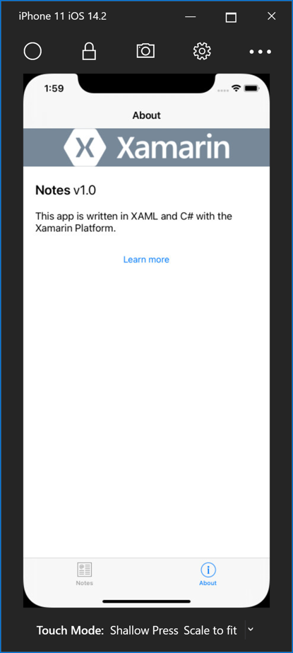 using System; using Xamarin.Essentials; using Xamarin.Forms; namespace Notes.Views { public partial class AboutPage : ContentPage { public AboutPage() { InitializeComponent(); } async void OnButtonClicked(object sender, EventArgs e) { // Launch the specified URL in the system browser. await Launcher.OpenAsync("https://aka.ms/xamarin-quickstart"); } } }此代码定义
