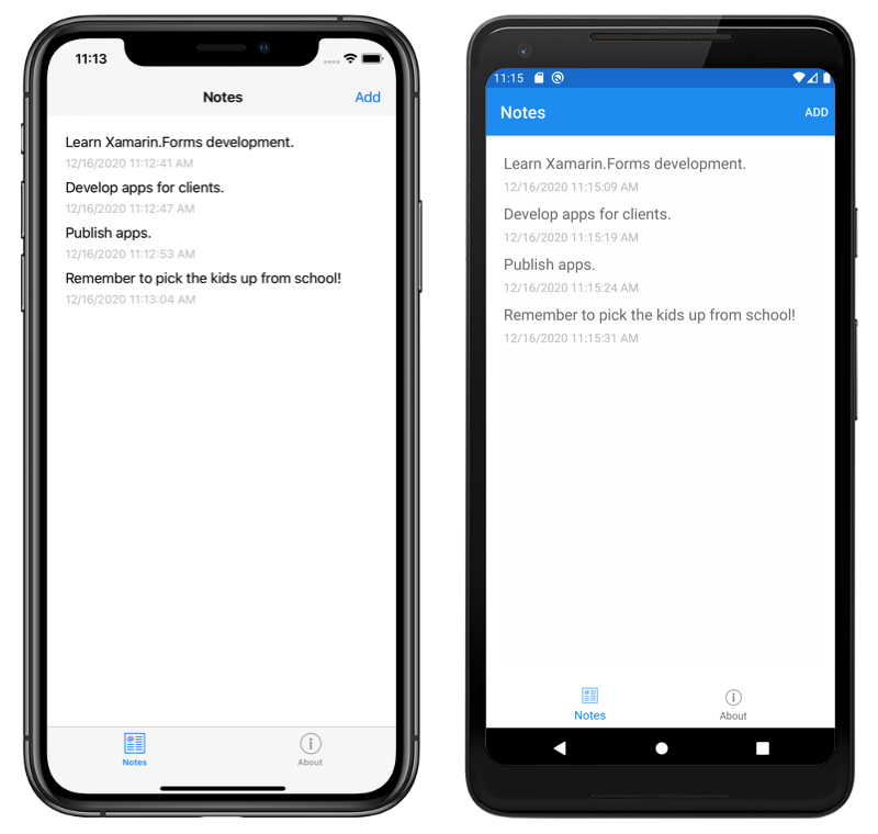 本快速入门演练如何通过 Xamarin.Forms Shell 应用程序将数据存储在本地 SQLite.NET 数据库中。 最终的应用程序如下所示: