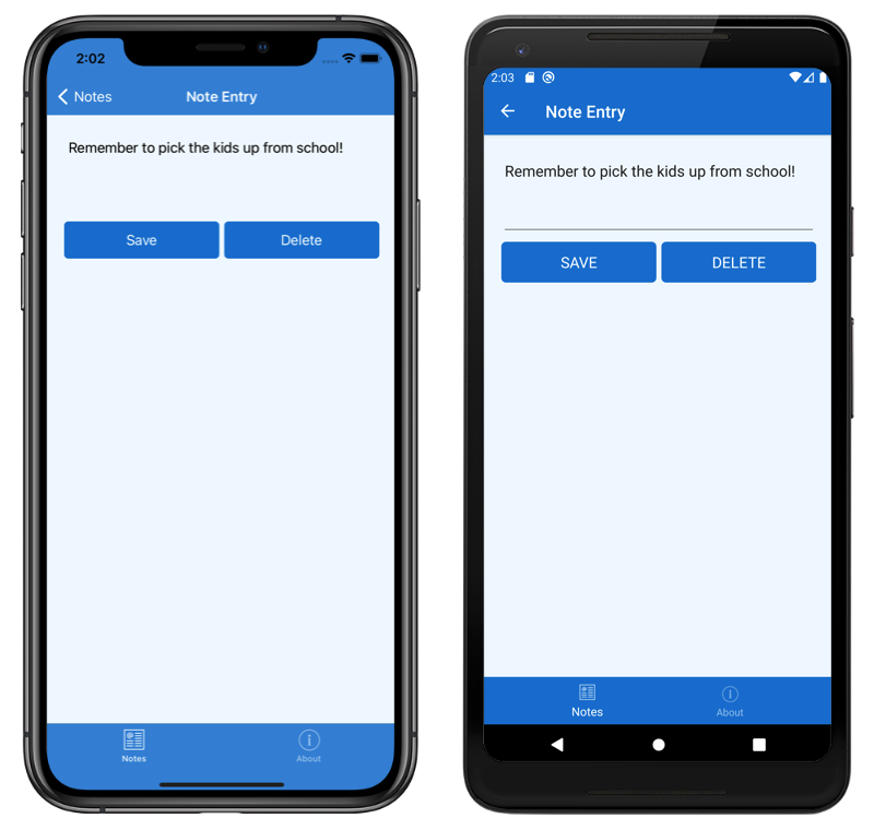 <?xml version="1.0" encoding="UTF-8"?> <ContentPage xmlns="http://xamarin.com/schemas/2014/forms" xmlns:x="http://schemas.microsoft.com/winfx/2009/xaml" x:Class="Notes.Views.NoteEntryPage" Title="Note Entry"> <ContentPage.Resources> <!-- Implicit styles --> <Style TargetType="{x:Type Editor}"> <Setter Property="BackgroundColor" Value="{StaticResource AppBackgroundColor}" /> </Style> </ContentPage.Resources> <!-- Layout children vertically --> <StackLayout Margin="{StaticResource PageMargin}"> <Editor Placeholder="Enter your note" Text="{Binding Text}" HeightRequest="100" /> <!-- Layout children in two columns --> <Grid ColumnDefinitions="*,*"> <Button Text="Save" Clicked="OnSaveButtonClicked" /> <Button Grid.Column="1" Text="Delete" Clicked="OnDeleteButtonClicked"/> </Grid> </StackLayout> </ContentPage>此代码将