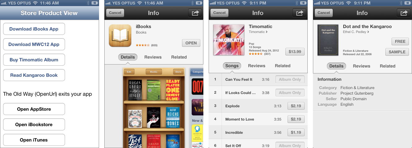 示例应用程度包括演示如何在早期版本的 iOS 中打开 App Store、iTunes 或 iBookstore 的代码。 使用 OpenUrl 方法打开一个正确制作的 itunes.com URL。