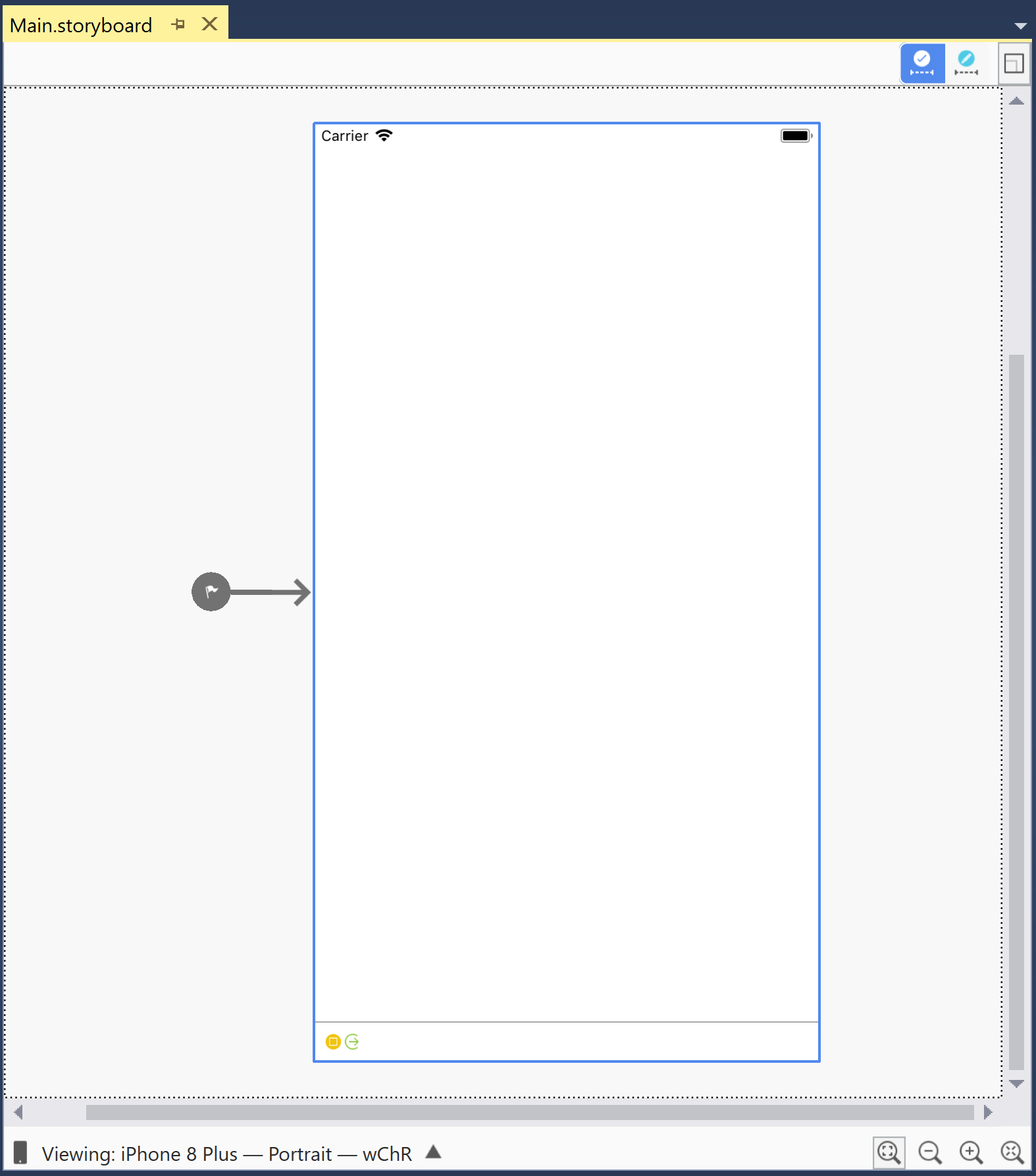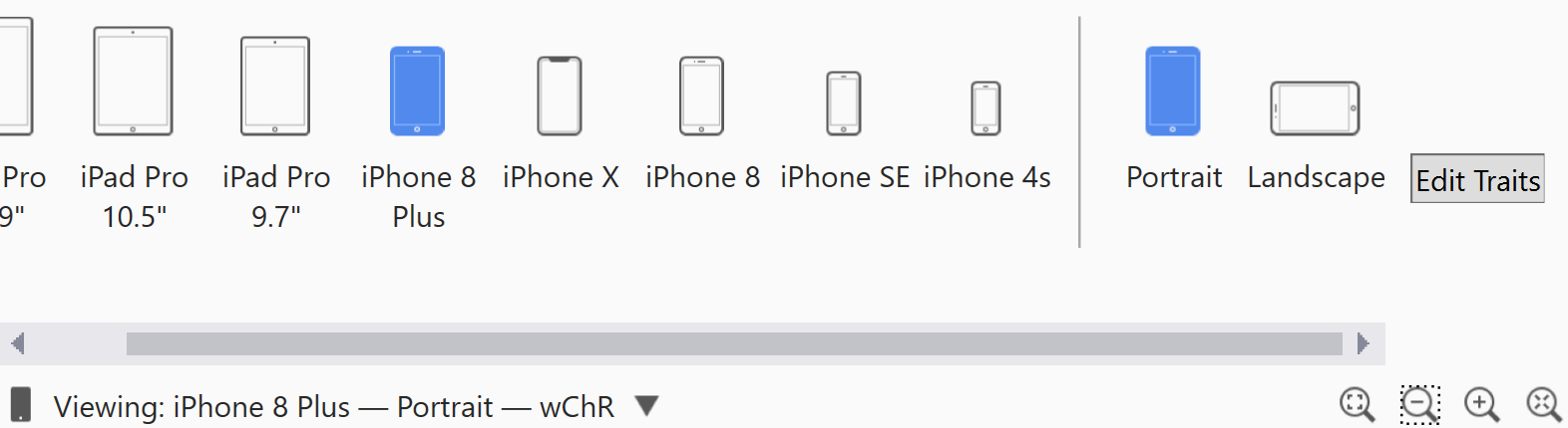 底部工具栏提供了一种选择设备、方向和缩放的方法,用于在 iOS 设计器中查看情节提要或 .xib 文件: