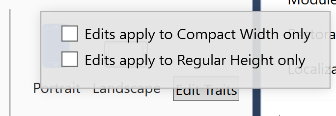 当大小类处于启用状态时,“编辑特征”按钮将显示在展开的底部工具栏中。 单击“编辑特征”按钮会显示用于根据所选设备和方向所代表的大小类创建界面变体的选项。 请开考虑以下示例: