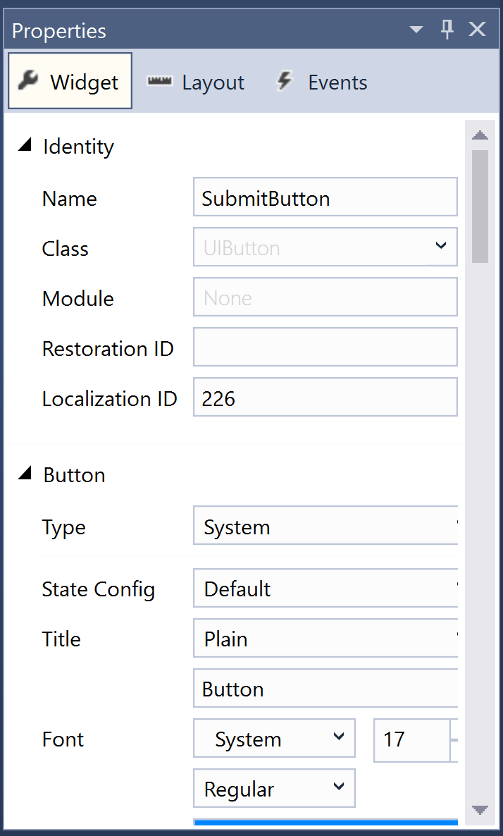 使用 Properties Pad 可以编辑控件的标识、视觉样式、辅助功能和行为。 以下屏幕截图演示了按钮的 Properties Pad 选项: