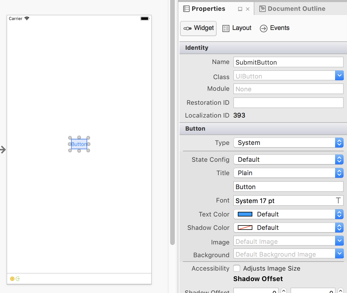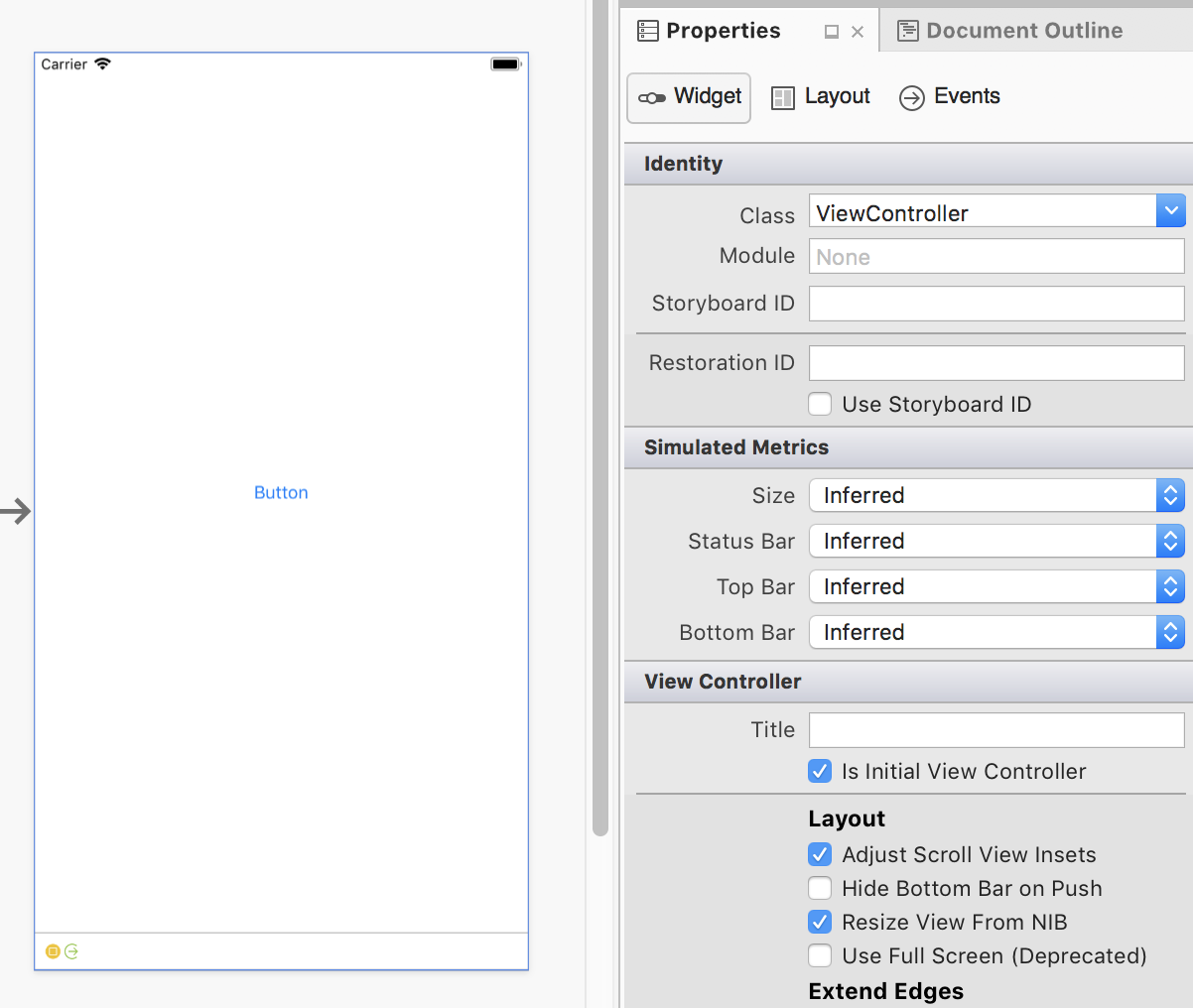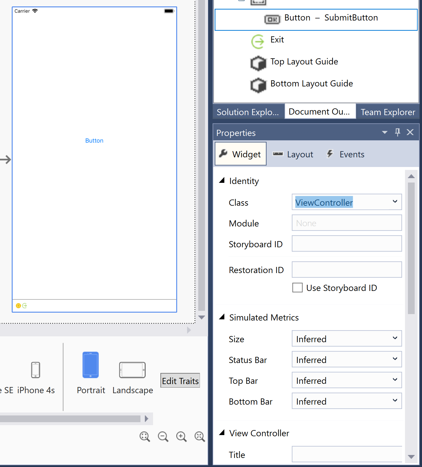 - 文档大纲 – 显示构成正在编辑的界面布局的控件树。 单击树中的某个项会在 iOS 设计器中选择该项,并在“Properties Pad”中显示其属性。 这对于在深度嵌套的用户界面中选择特定控件非常方便。