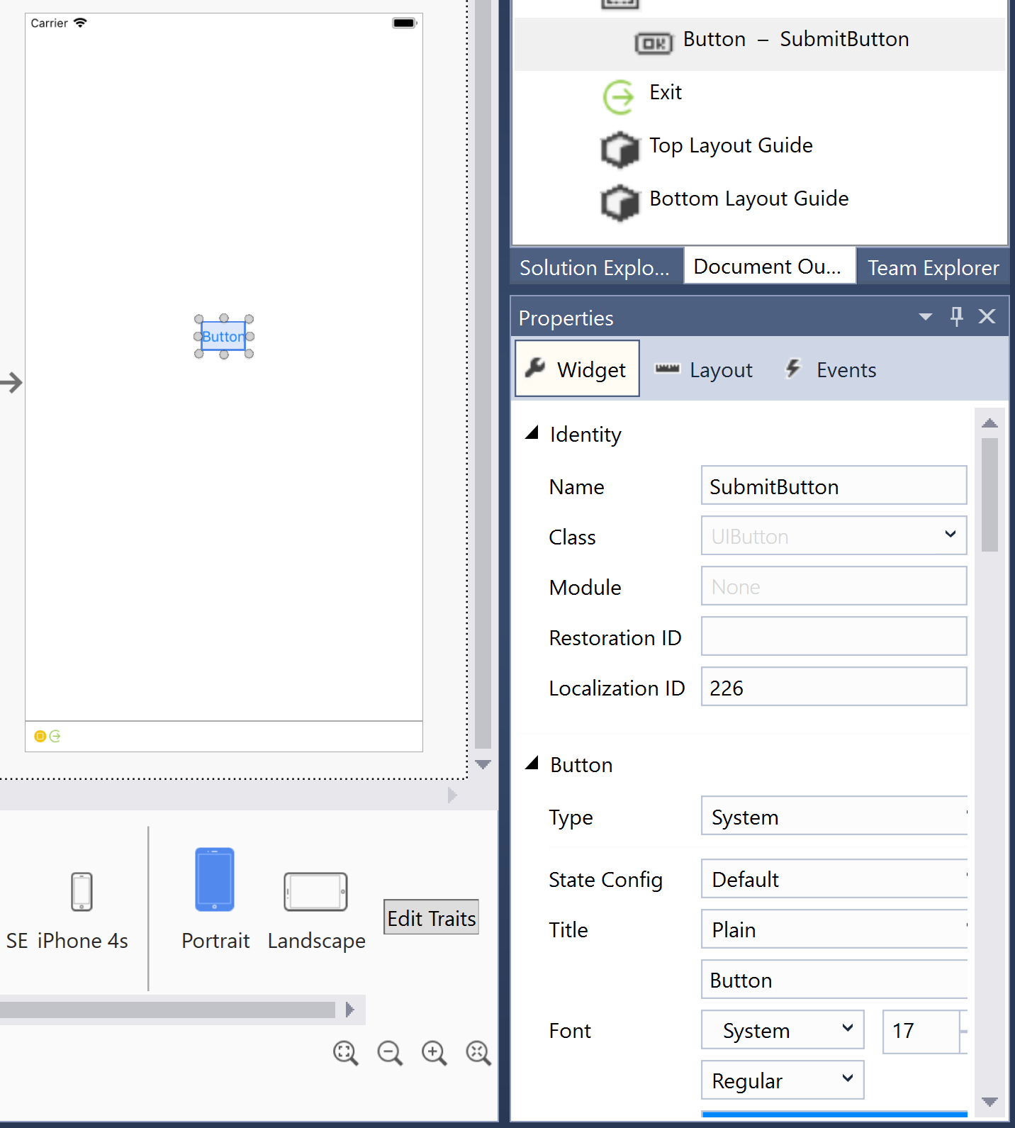 为了在代码中访问和操控按钮,必须为它提供唯一的标识符。 可以通过选择按钮,打开“Properties Pad”并将其“名称”字段设置为“SubmitButton”之类的值来提供唯一标识符: