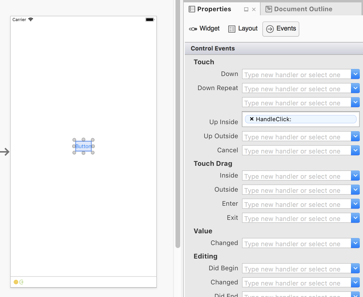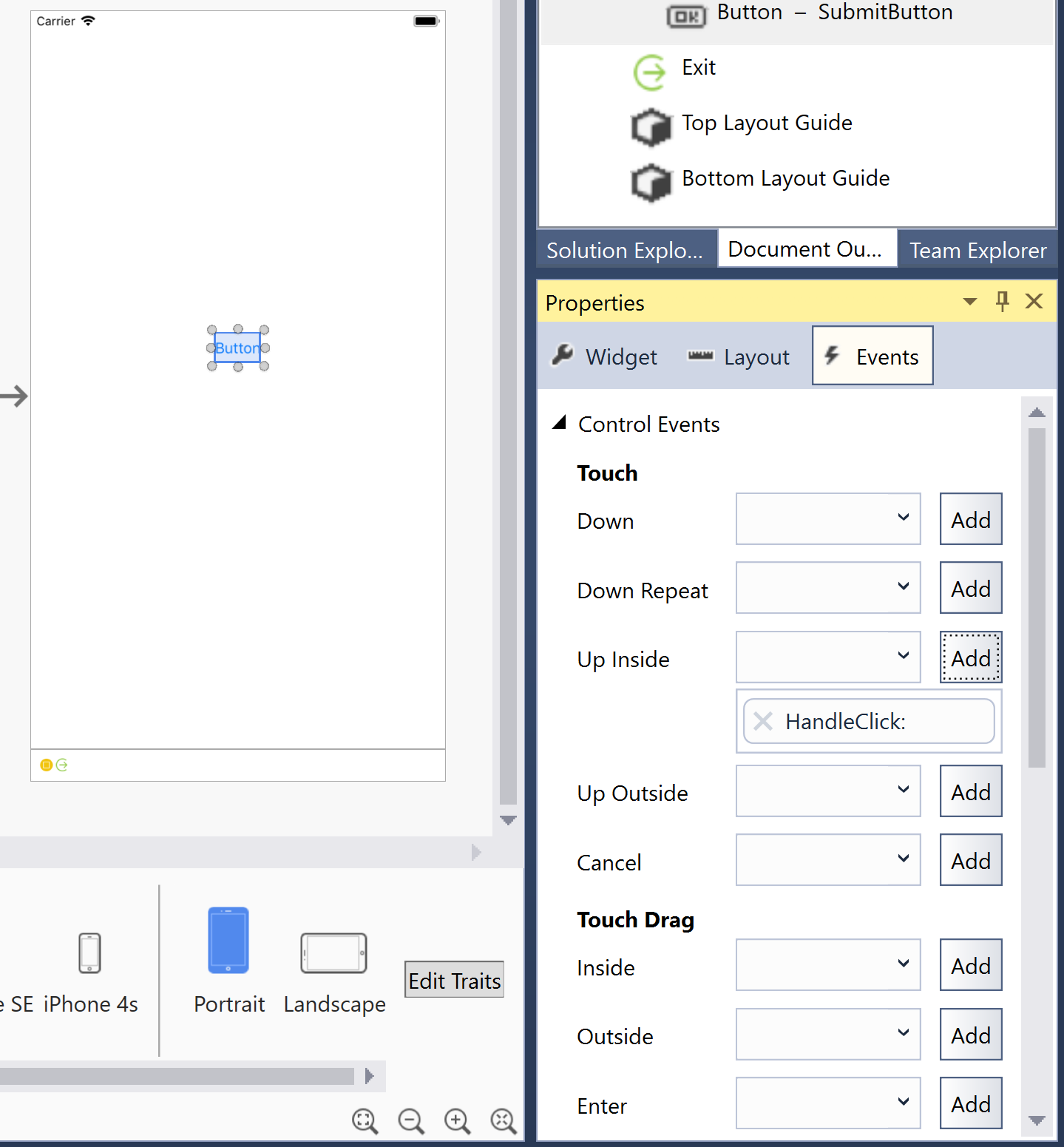 若要为各种事件指定自定义事件处理程序,请使用“Properties Pad”的“事件”选项卡。 例如,在以下屏幕截图中,HandleClick 方法处理按钮的“Touch Up Inside”事件: