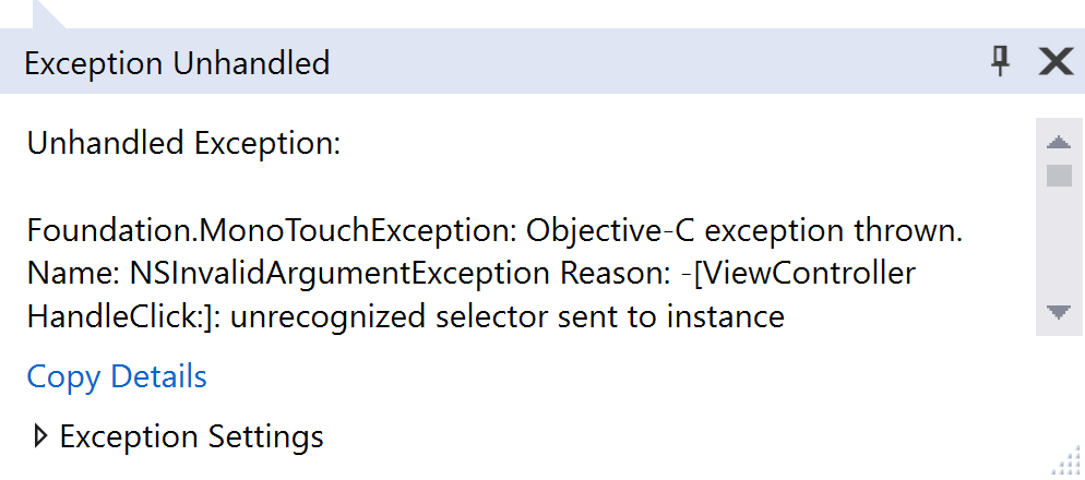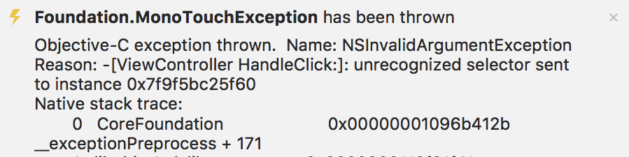 指定事件处理程序后,必须将同名的方法添加到相应的视图控制器类。 否则,点击按钮时会发生 unrecognized selector 异常: