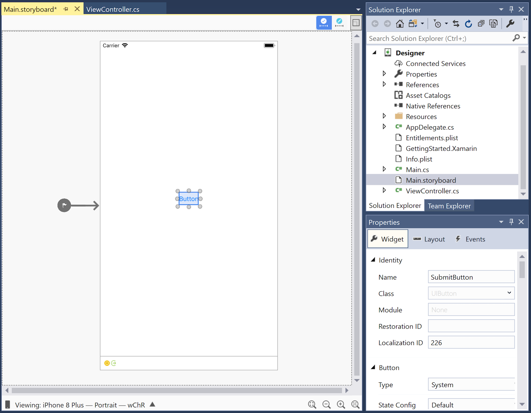 SubmitButton 属性声明将整个 ViewController 类(而不仅仅是 ViewController.designer.cs 文件)连接到情节提要中定义的按钮。 由于 ViewController.cs 定义了 ViewController 类的一部分,因此它可以访问 SubmitButton。