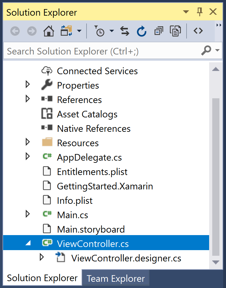 在“Solution Pad”中,导航到“ViewController.cs”并单击公开指示器后会发现,视图控制器的 ViewController 类定义跨越两个文件,每个文件包含一个分部类定义: